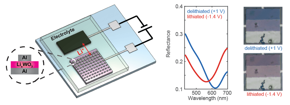 By coupling gap plasmons in aluminium plasmonic nanoparticle arrays with an ultra-thin layer of electrochromic WO3, we demonstrate how one can electrochemically tune the structural color of a completely solid-state device! Our results have recently been published in Nano Letters.